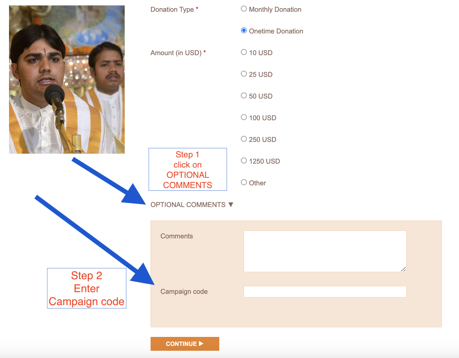 2. When donating on the website (https://aro.vedicpandits.org/donate) you can add a specific campaign code. It is easy to do – just click on the arrow beside OPTIONAL COMMENTS. A new section appears with two boxes. Then you can add the code in the box that says Campaign Code.