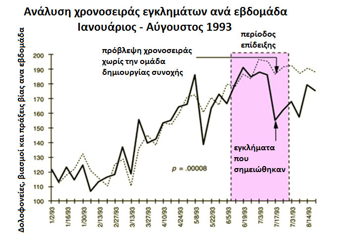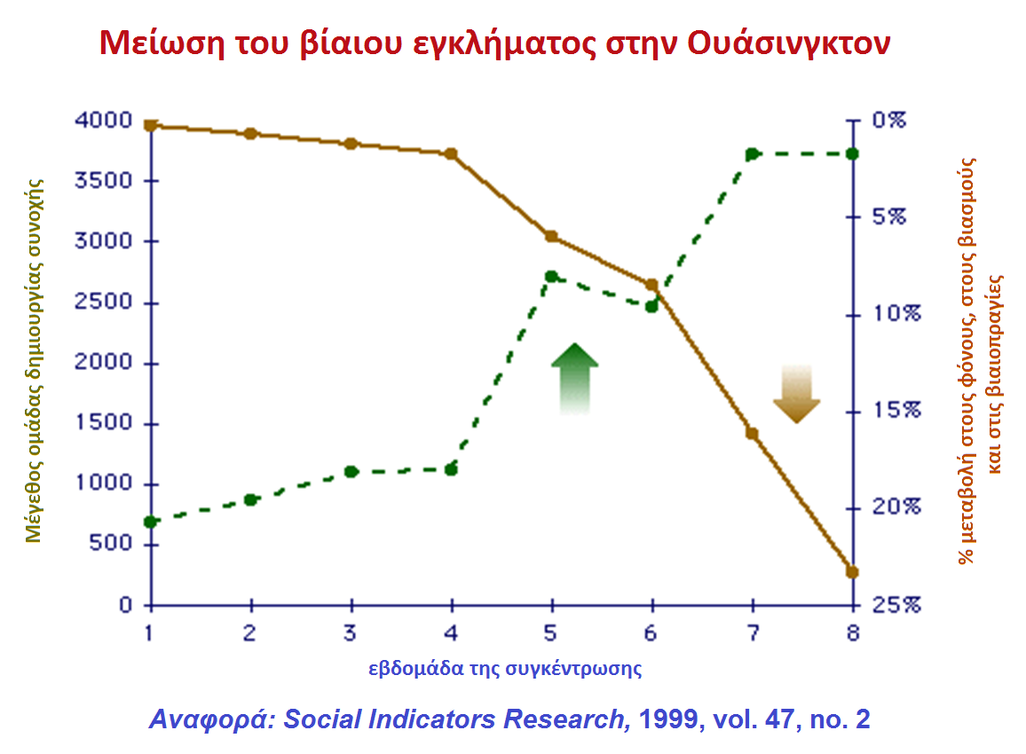 Το βίαιο έγκλημα μειώθηκε κατά σχεδόν 25% στην Washington DC, όταν μία ομάδα 4.000 Γιογκικών Ιπταμένων συγκεντρώθηκε για αρκετές εβδομάδες, το καλοκαίρι του 1993 (βλέπε διάγραμμα παρακάτω).