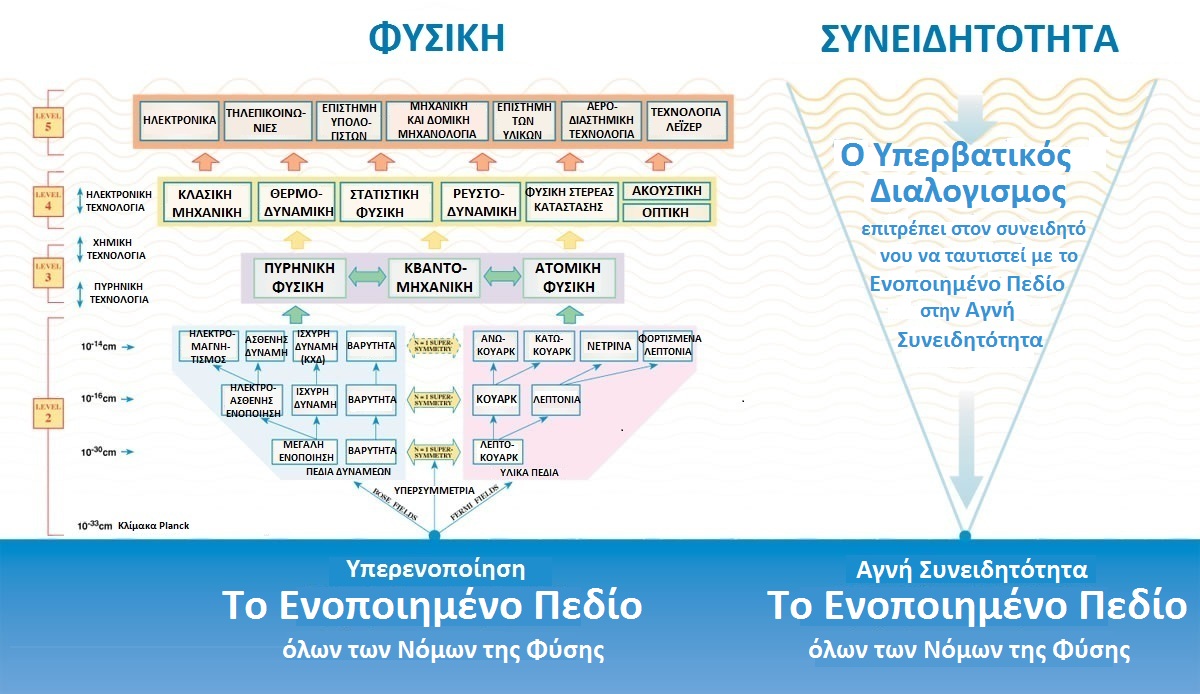 Για παράδειγμα, η σύγχρονη φυσική έχει ανακαλύψει πιο ενοποιημένα επίπεδα της λειτουργίας της φύσης, σε μικρότερες κλίμακες χώρου και χρόνου. Η κορύφωση αυτής της πορείας της φυσικής είναι ανακάλυψη του Ενοποιημένου Πεδίου (ή αλλιώς του «πεδίου των υπερχορδών»), που αποτελεί τη βάση και το σημείο ένωσης όλων των ποικιλόμορφων δυνάμεων και σωματιδίων του σύμπαντος (βλέπε το διάγραμμα στα δεξιά).