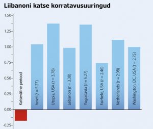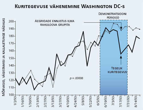 Washington DC-s vähenes vägivallakuritegude arv peaaegu 25% kui 4000 Joogalendajat 1993 aasta suvel mitmeks nädalaks sinna kogunes (vaata allolevat diagrammi). See uuring avaldati 1999 aastal eelretsenseeritud ajakirjas Social Indicators Research. Social Indicators Research 1999 47(2):153-201.