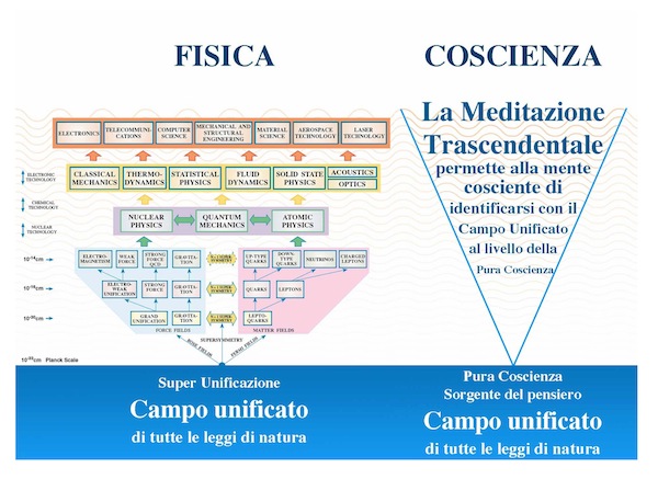 Allo stesso modo la Meditazione Trascendentale e il programma di MT-Sidhi danno l’esperienza diretta di livelli più quieti e profondi del pensiero, fino all’esperienza del campo unificato presente alla base della mente e della materia. La pratica di gruppo stimola potentemente questo campo unificato universale della coscienza collettiva, creando un’influenza coerente in tutta la società.