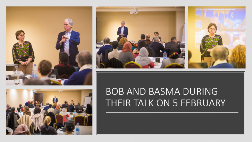 Two weeks ago, on the 5th of February, we had the honour of welcoming Bob Roth in Ramallah to give a talk to about 45 different audiences, many of them professionals. It was a great success! Dr Roth made the promise that he will help raise the funds for teaching TM to 1000 persons in Palestine.