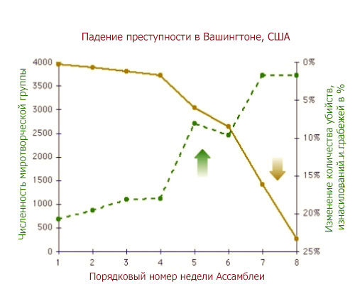 Число тяжких преступлений в Вашингтоне (США) сократилось почти на 25%, когда группа из 4000 Летающих Йогов собралась там на несколько недель летом 1993 года (смотри диаграмму ниже). Это исследование было опубликовано в 1999 году в авторитетном научном журнале «Исследования социальных показателей» (Social Indicators Research) 1999 47(2):153-201.