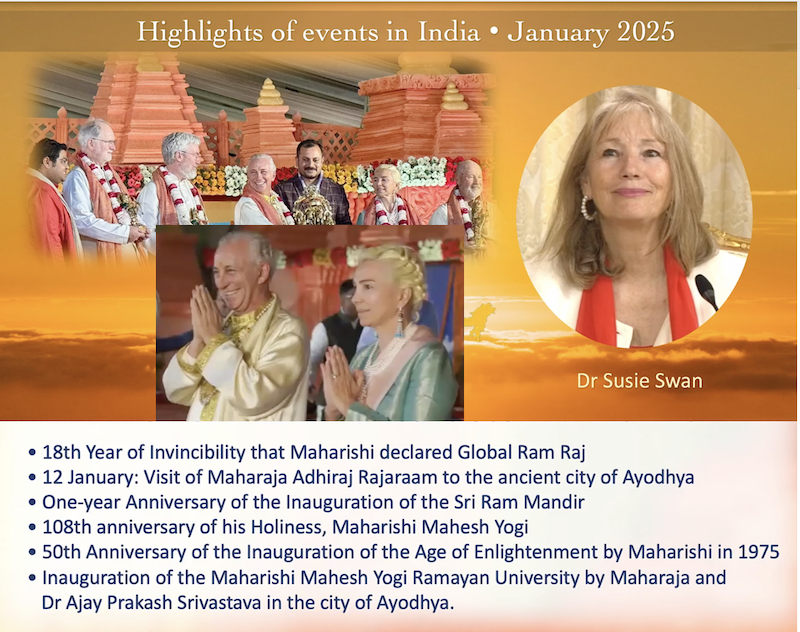 Dr Susie Swan was the host. The video of the afternoon session includes a Maharishi Talk ‘Training Vedic Pandits to Create Harmony in Society’.